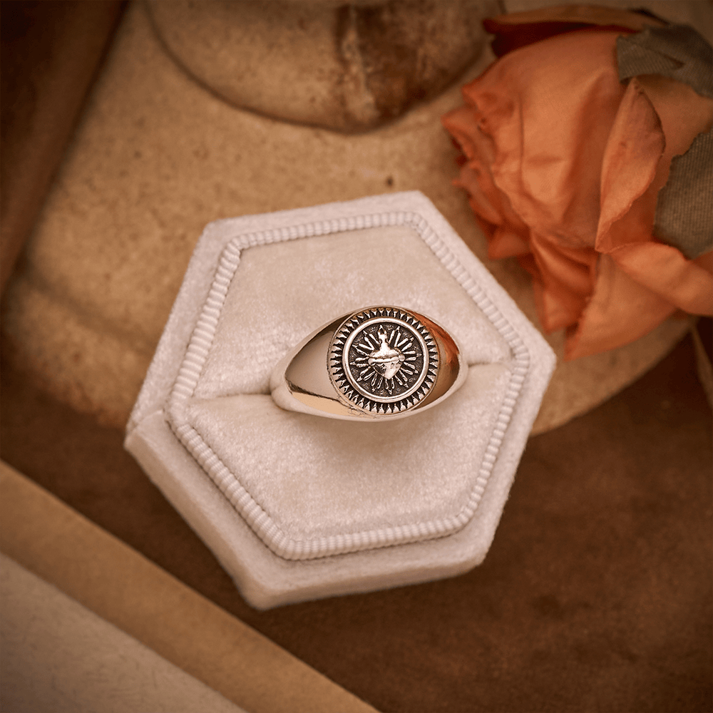 The centerpiece of this ring is the iconic Sacred Heart, meticulously engraved with radiant lines that simulate celestial light. Crafted from high-quality copper and finished with an antique silver-toned patina, the design highlights the profound symbolism of the flaming heart, representing eternal compassion and the enduring flame of faith.